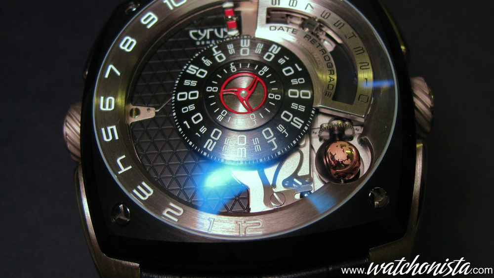 Dieses Stück kombiniert die Vorteile von Digital-Display-Uhren für die schnelle Zeiterfassung und die mit einem Zeiger-Display verbundenen Qualitäten für sein kartografisches Aussehen. Zum Beispiel zeigt der auf den Fotos abgebildete Klepcys 23h33 an. Ja, 23h33 und nicht 11h33, weil der Unterschied zwischen Tag und Nacht scharfsinnig angegeben wird: Die Stunde «Hand» dreht sich um und zeigt eine Farbe, die dem Tag oder der Nacht entspricht. Willkürlich ist in diesem Fall das Rot für die Nacht und das Weiß für den Tag. Beide Farben sind die der Monaco-Flagge, und auf der mittleren Scheibe (Sekunden), die das Cyrus-Logo trägt, sowie auf der Zahl «11» (Stunden) sind rote Nuancen zu sehen.